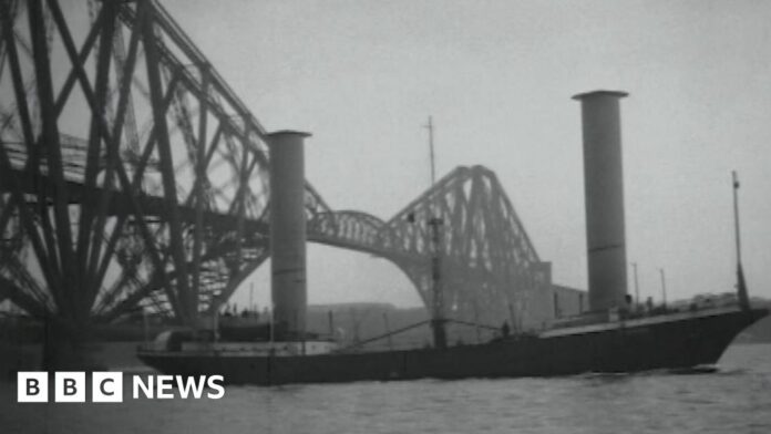 Pathe NewsIt must have been a bizarre sight when a freight ship, equipped with two large rotating towers, made its way under the Forth Bridge a century ago.